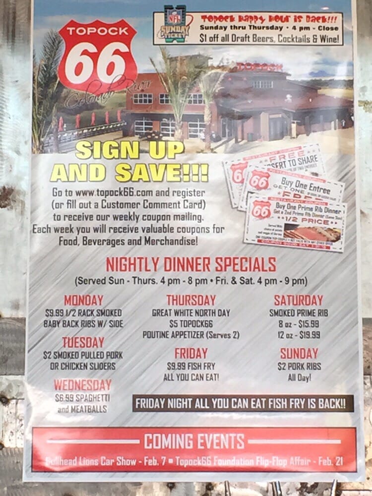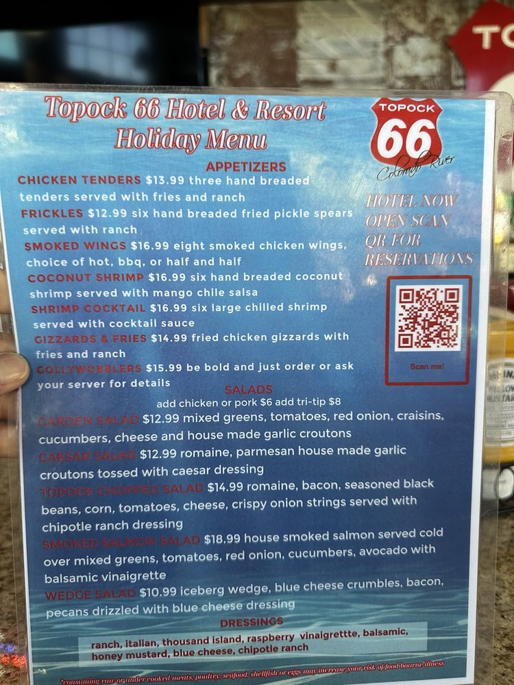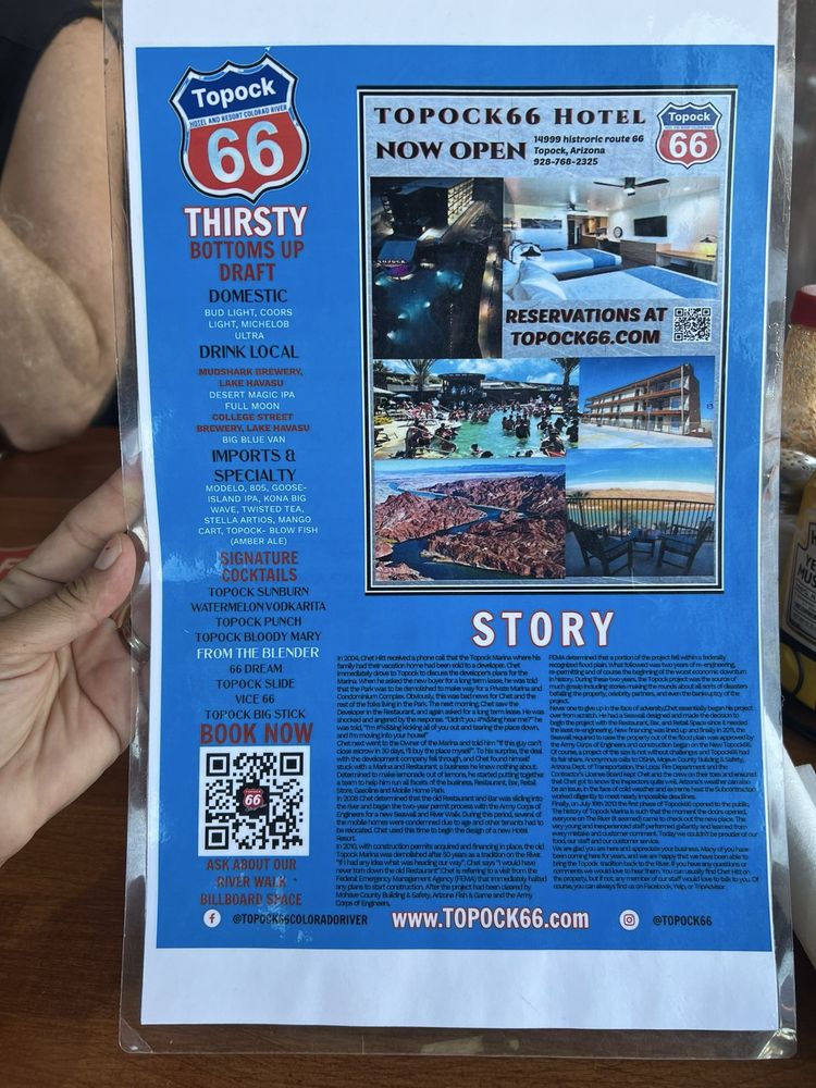 Topock 66 thrives on a lively atmosphere, enhanced by outdoor seating and live music on weekends. Guests can unwind over a refreshing drink from the full bar while enjoying covered outdoor spaces, making it a perfect stop for tourists and locals alike. With speedy service highlighted by reviews praising staff like Isabella and Teyla, every visit promises satisfaction. Whether you’re dining in or taking out, Topock 66 welcomes you to savor an unforgettable culinary experience on your Route 66 journey!